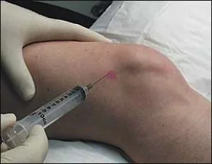 Quando existe liquido sinovial dentro do joelho, que chamamos de derrame articular em linguagem medica, eu sempre punciono antes da aplicação do produto.