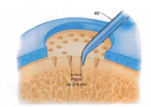 Em casos de microlesão, primeiro faz uma raspagem no local que está com o defeito deixando um espaço de 3 a 5mm entre os furos. Nessa técnica a perfuração é de 3mm.