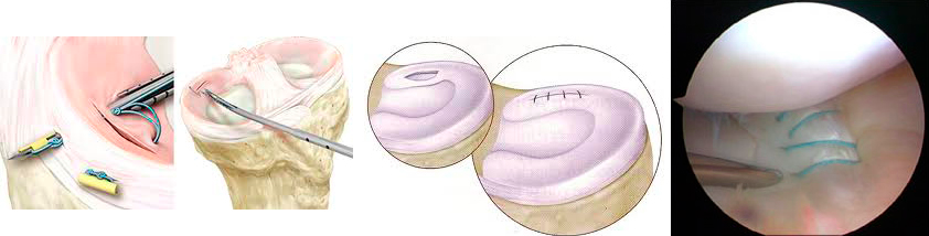 - Sutura meniscal, mantendo a função do amortecedor: Aqui, o menisco não é retirado, mas sim costurado, permitindo que ele cicatrize e continue exercendo sua função de amortecedor. É como consertar um pneu em vez de trocá-lo: mantendo a estrutura original, o impacto entre os ossos continua sendo absorvido, protegendo a cartilagem e reduzindo o risco de artrose futura.